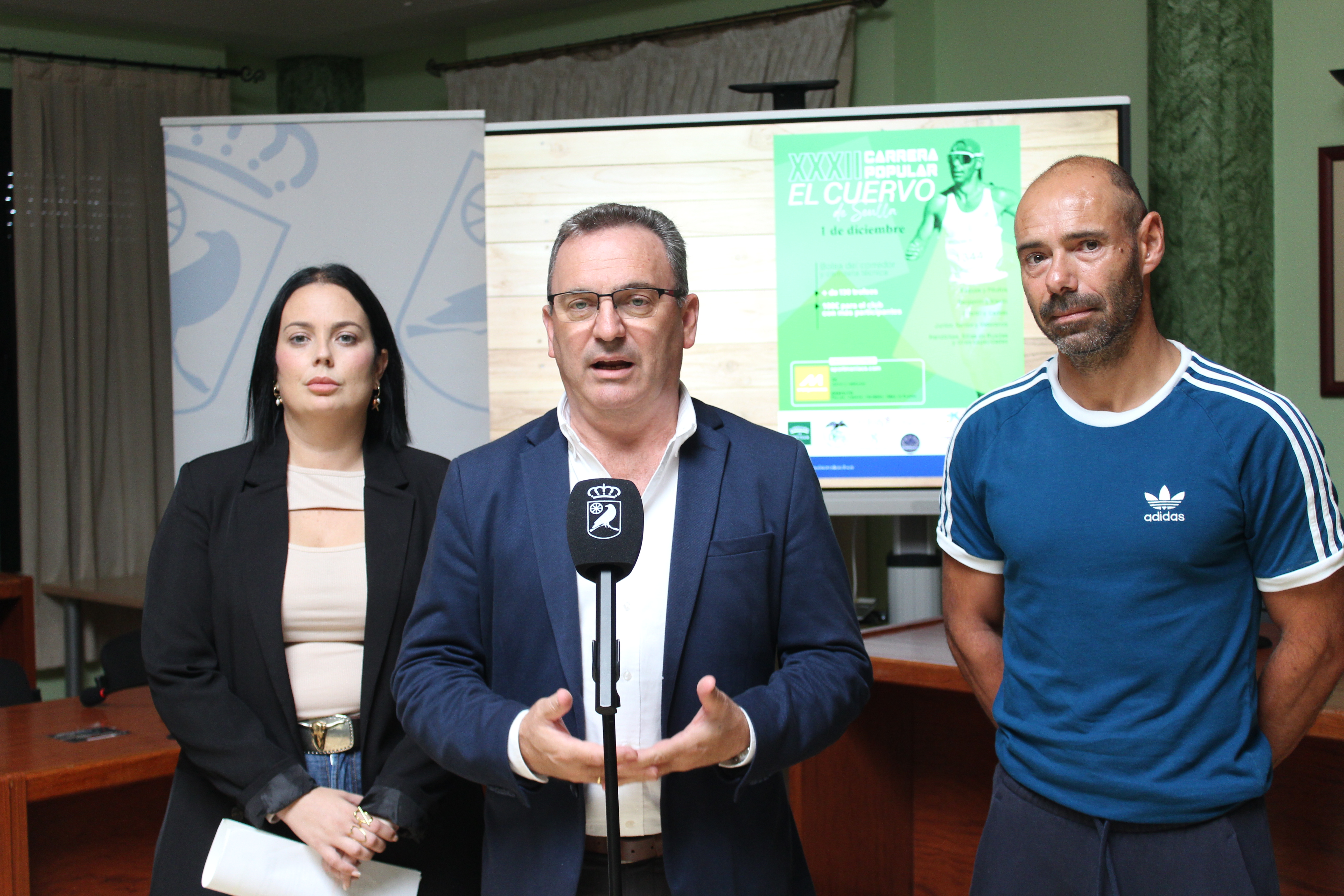 El alcalde de El Cuervo de Sevilla, José Manuel Oliva, acompañado de la delegada de Deportes, Mª Carmen Vega, y el atleta local Jorge Lara, han dado a conocer la XXXII Carrera Popular de la localidad que tendrá lugar el próximo 1 de diciembre.