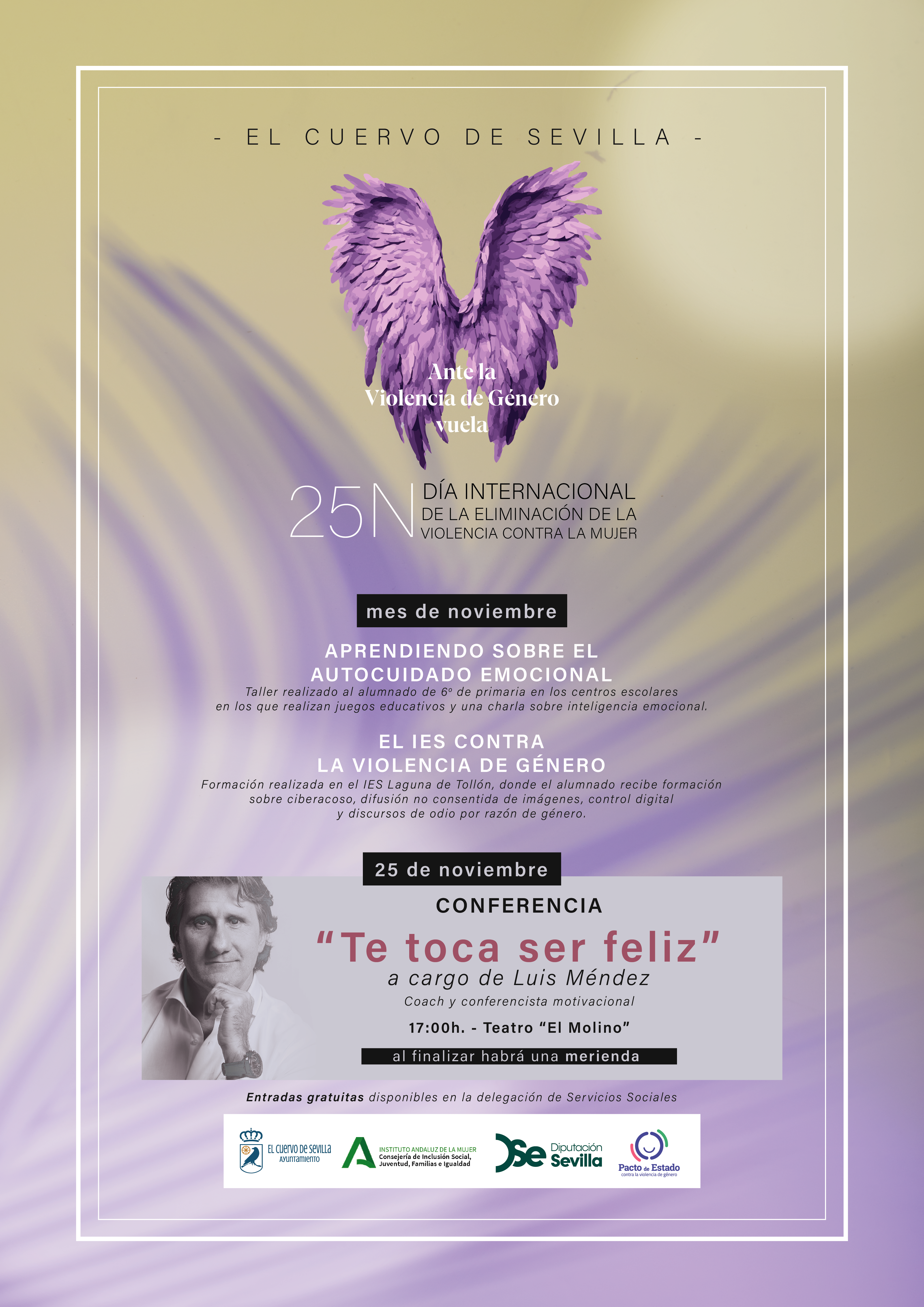 Así mismo, el 25 de noviembre, como acto central de la campaña, se celebrará la conferencia “Te toca ser feliz”, a cargo del coach y conferencista motivacional Luis Méndez. El encuentro tendrá lugar a las 17:00 horas en el Teatro “El Molino”, y al finalizar se ofrecerá una merienda para los asistentes. La entrada será gratuita, con invitaciones disponibles para recoger en la Delegación de Servicios Sociales.