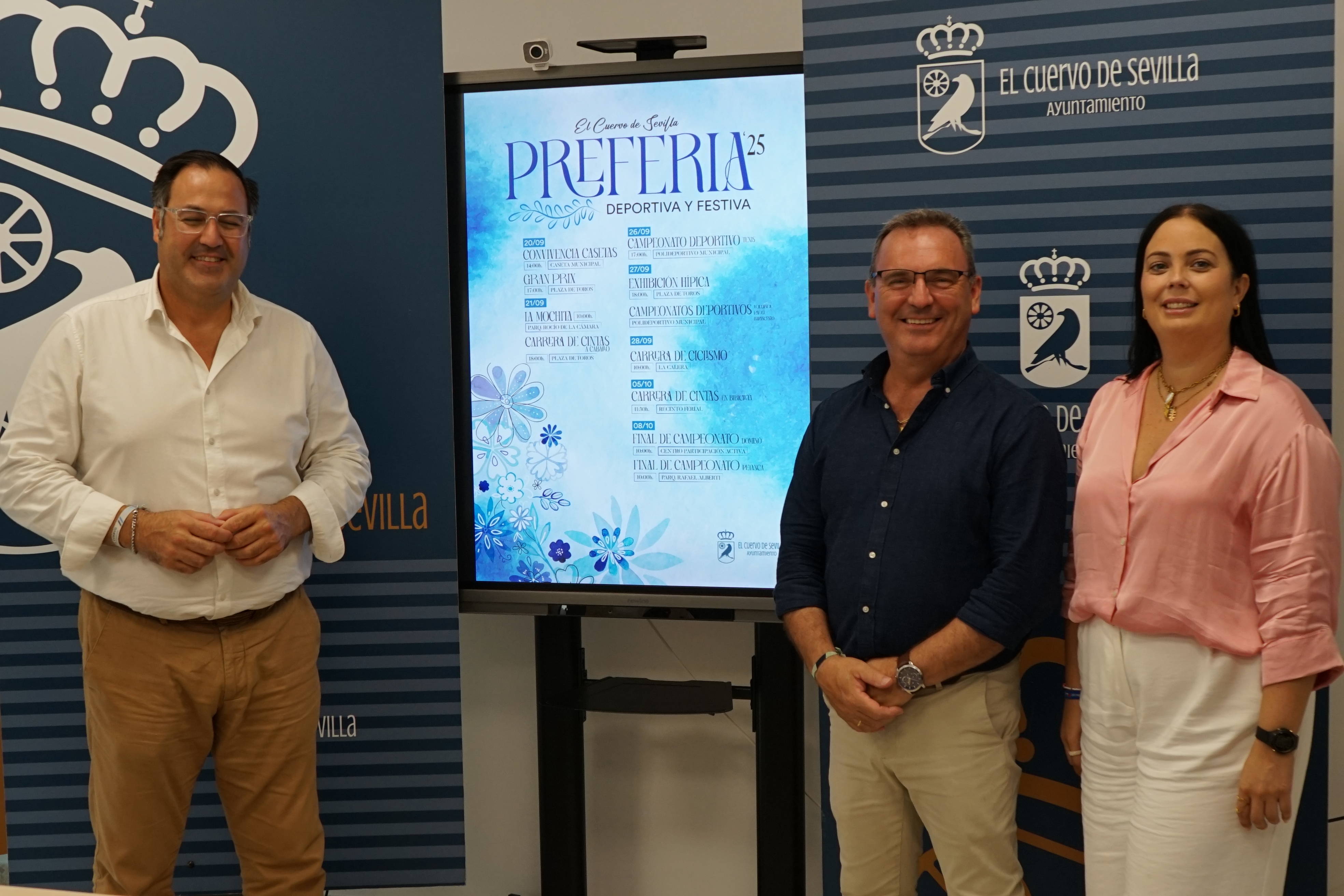 27 agosto de 2025.- El alcalde de El Cuervo de Sevilla, José Manuel Oliva junto a la delegada de Deportes, Mª Carmen Vega y el delegado de Fiestas, Silvestre Castells, han dado a conocer la programación oficial de las actividades de Preferia, que se desarrollarán en la localidad del 20 de septiembre al 6 de octubre de 2025.