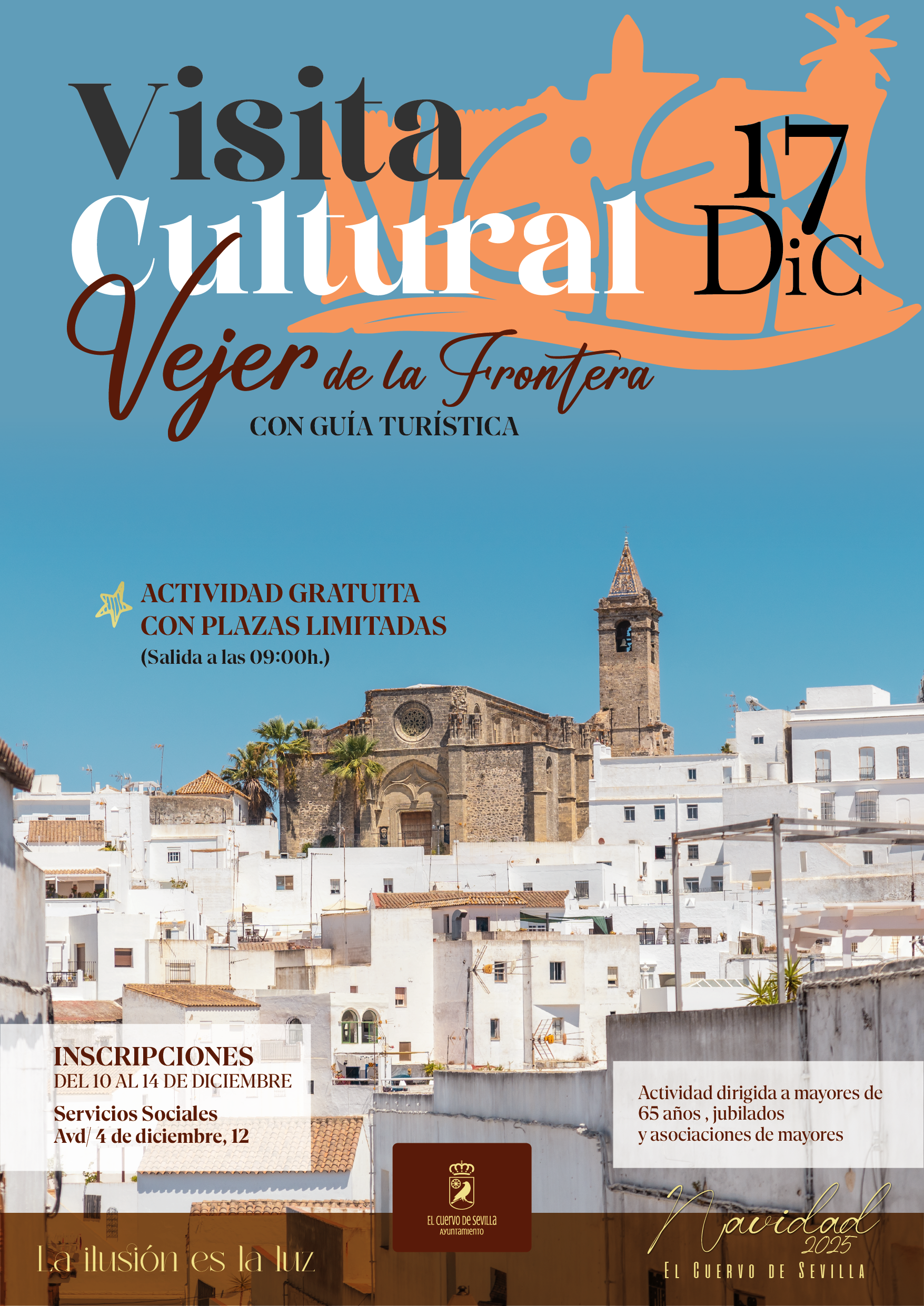 9 de diciembre de 2025.- El Ayuntamiento de El Cuervo de Sevilla, a través de la delegación del Mayor, anuncia la puesta en marcha de un viaje cultural a Vejer de la Frontera, enmarcado dentro del programa de actividades previstas con motivo de la Navidad.