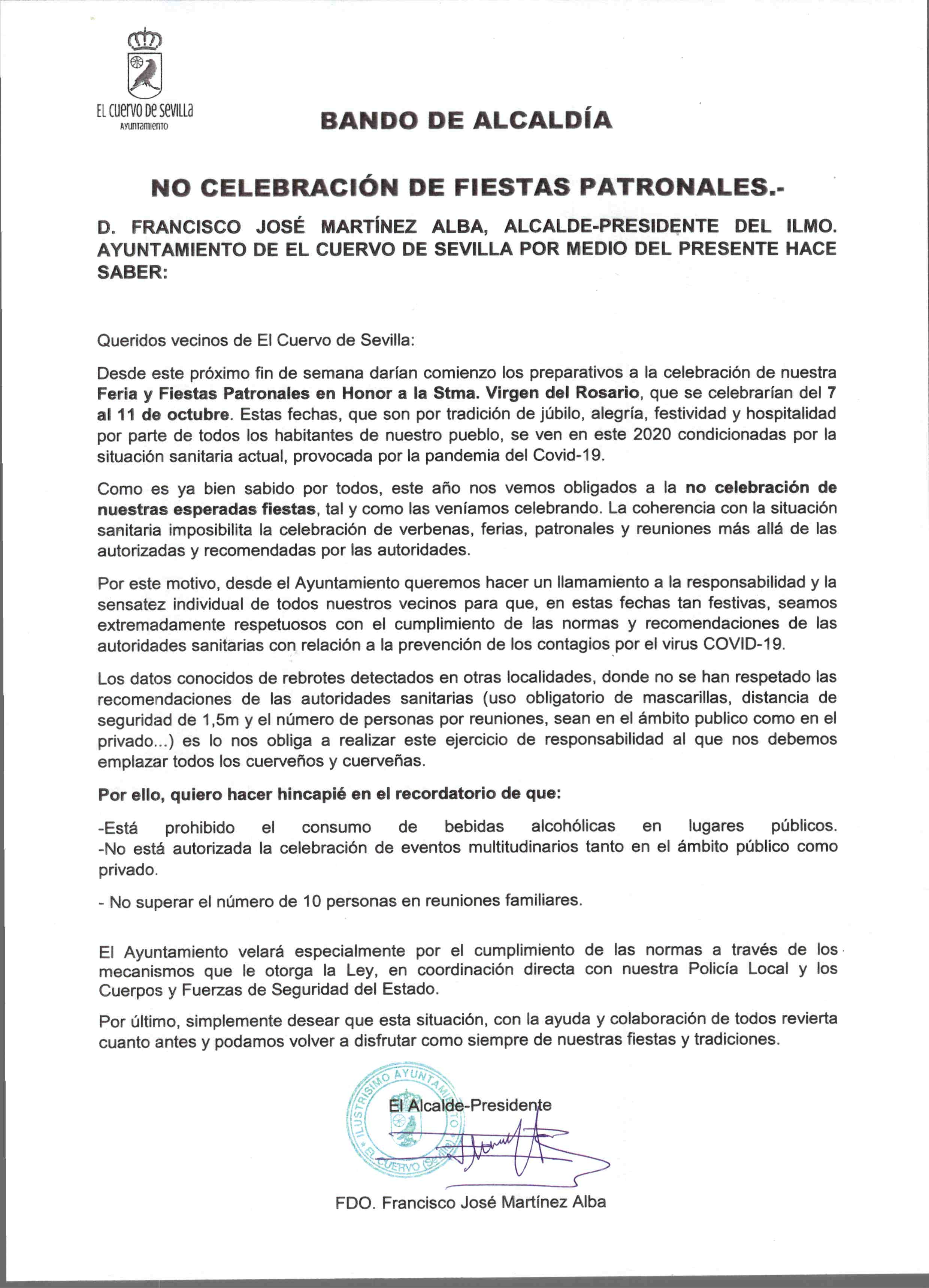 BANDO DE ALCALDÍA - NO CELEBRACIÓN DE FIESTAS PATRONALES