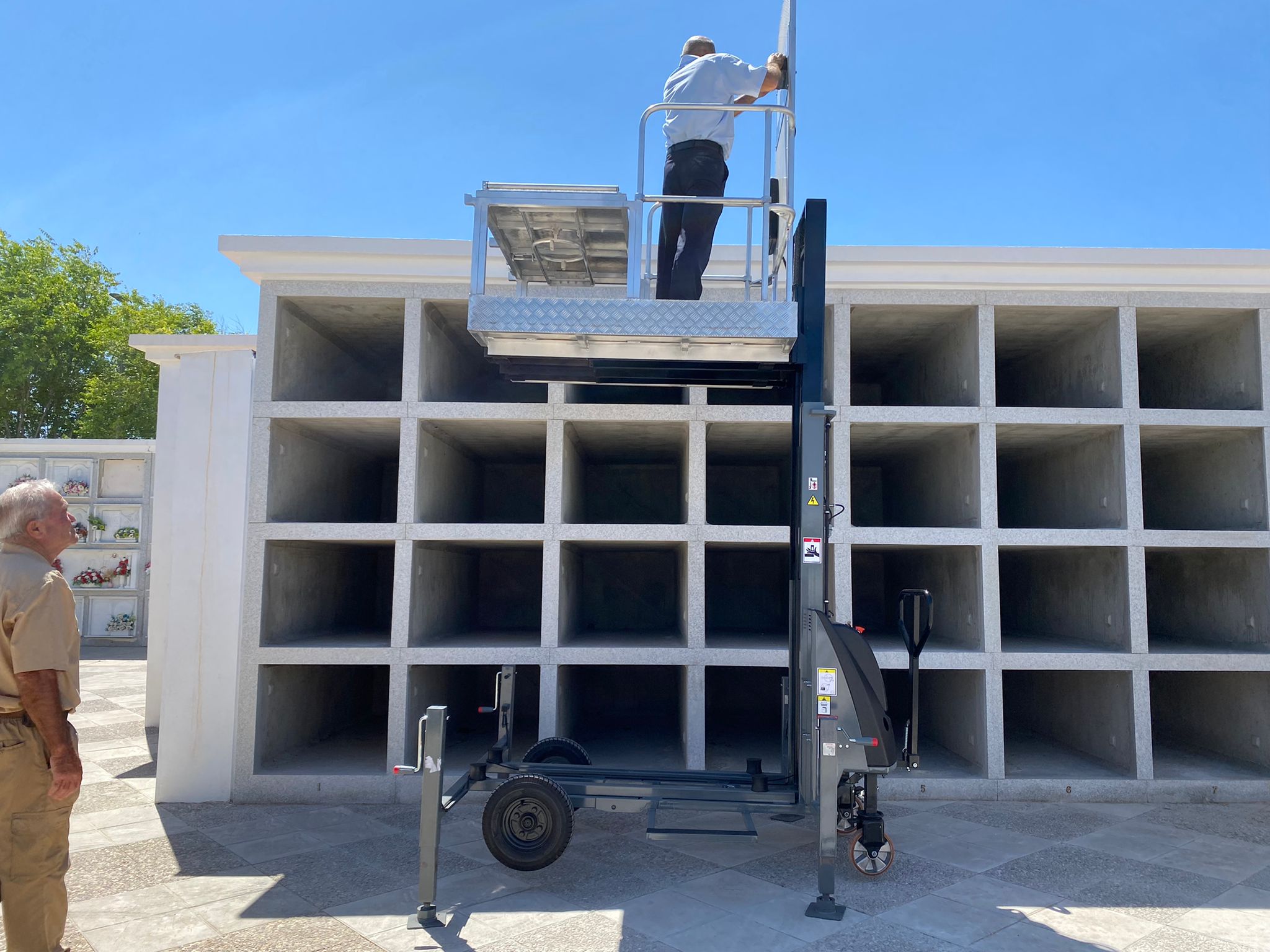 Martínez también ha detallado que, para mejorar las condiciones laborales de los trabajadores del Cementerio y optimizar el momento de depósito de los féretros en los nichos, se ha adquirido un portaféretro cuya financiación viene través del área de Concertación de Diputación de Sevilla con un coste de 18.147,58 euros.