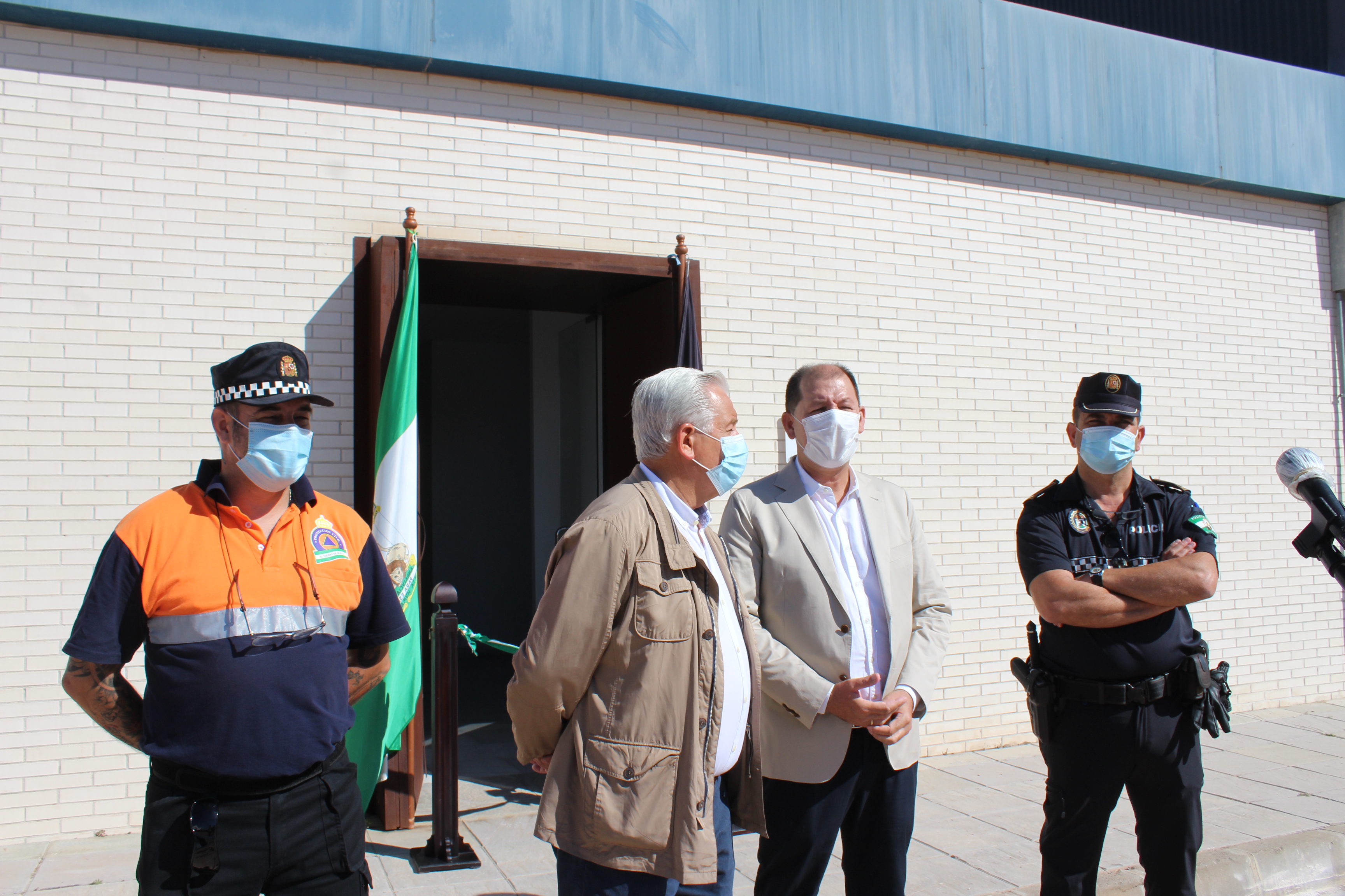 El alcalde Francisco J. Martínez, acompañado por el delegado de Seguridad Ciudadana Francisco Cordero, el Jefe Acctal. de la Policía Local y el Coordinador de Protección Civil El Cuervo ha inaugurado la nueva sede del grupo de voluntarios ubicada en las inmediaciones del pabellón municipal 'Juan Ramírez Monge'.