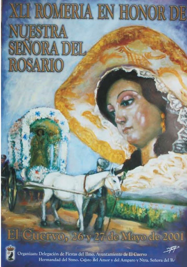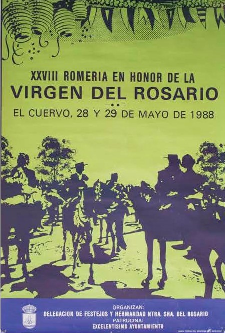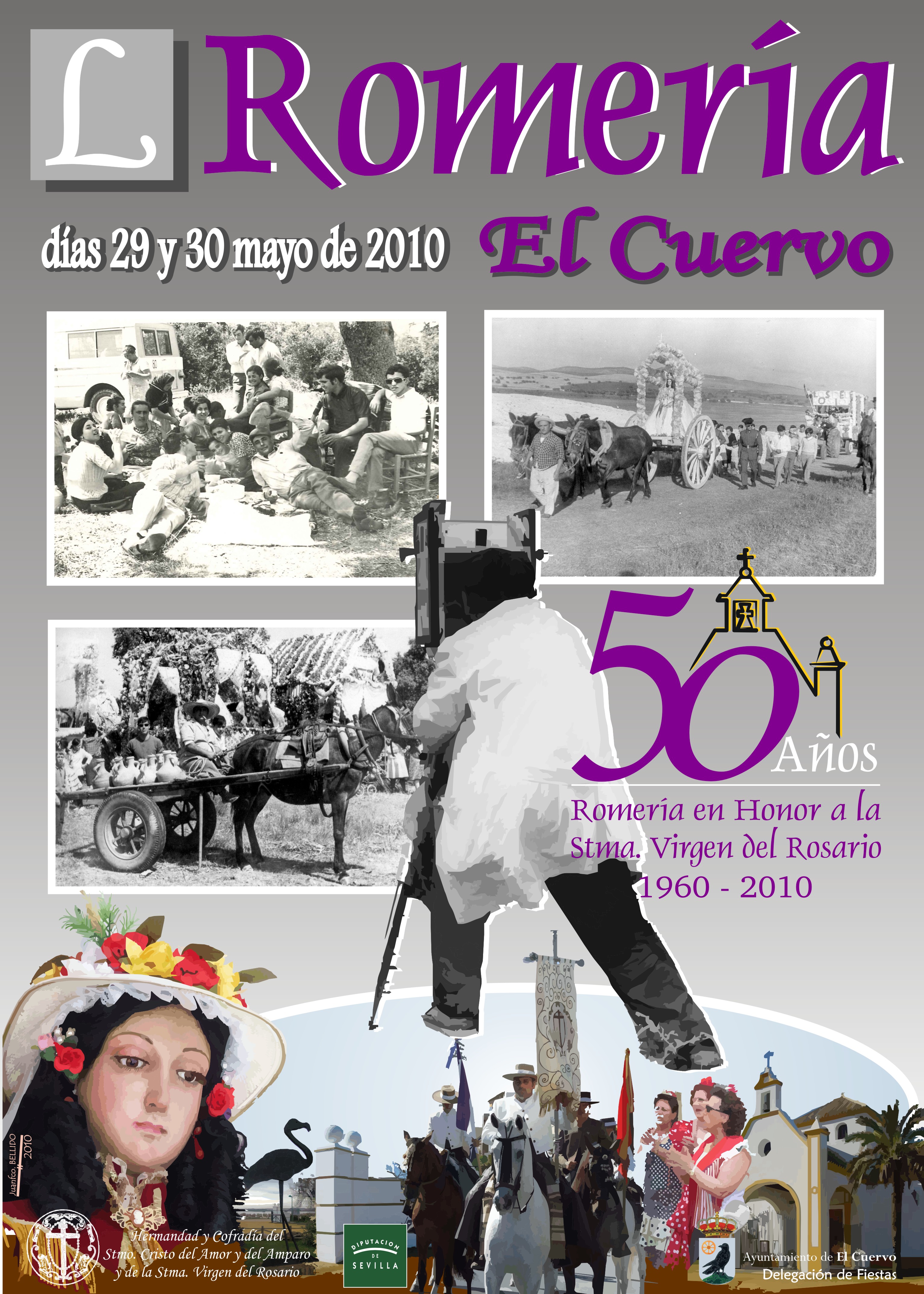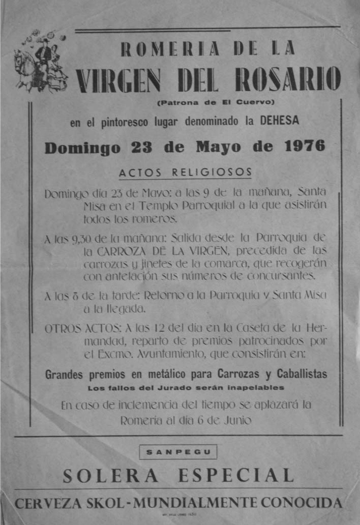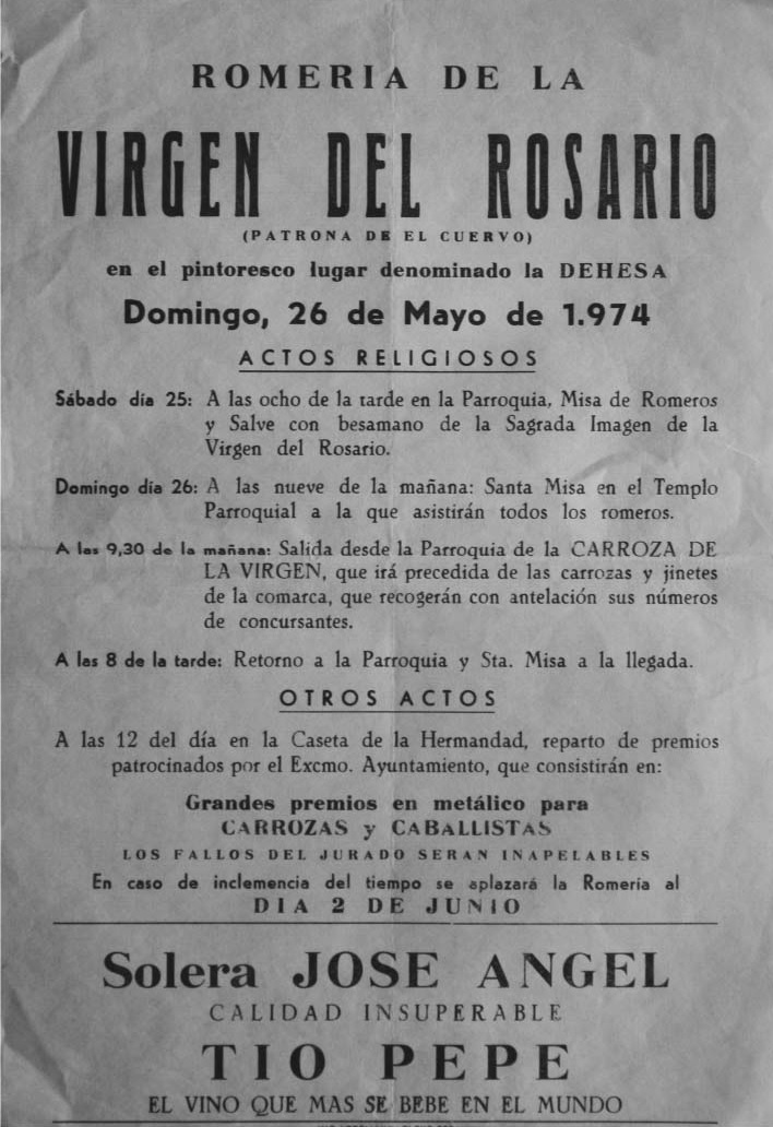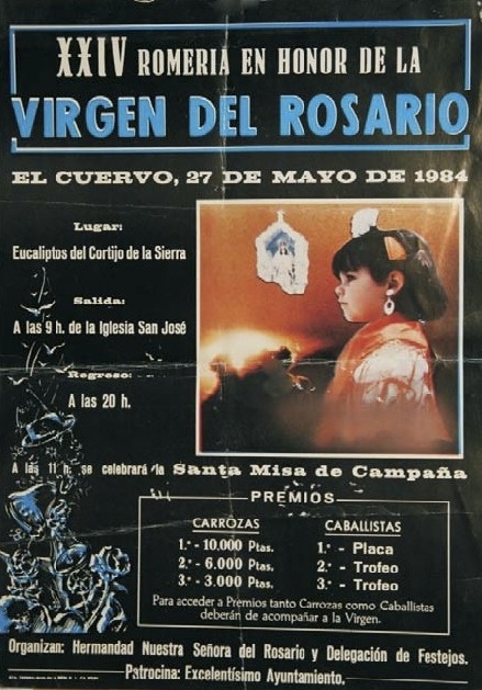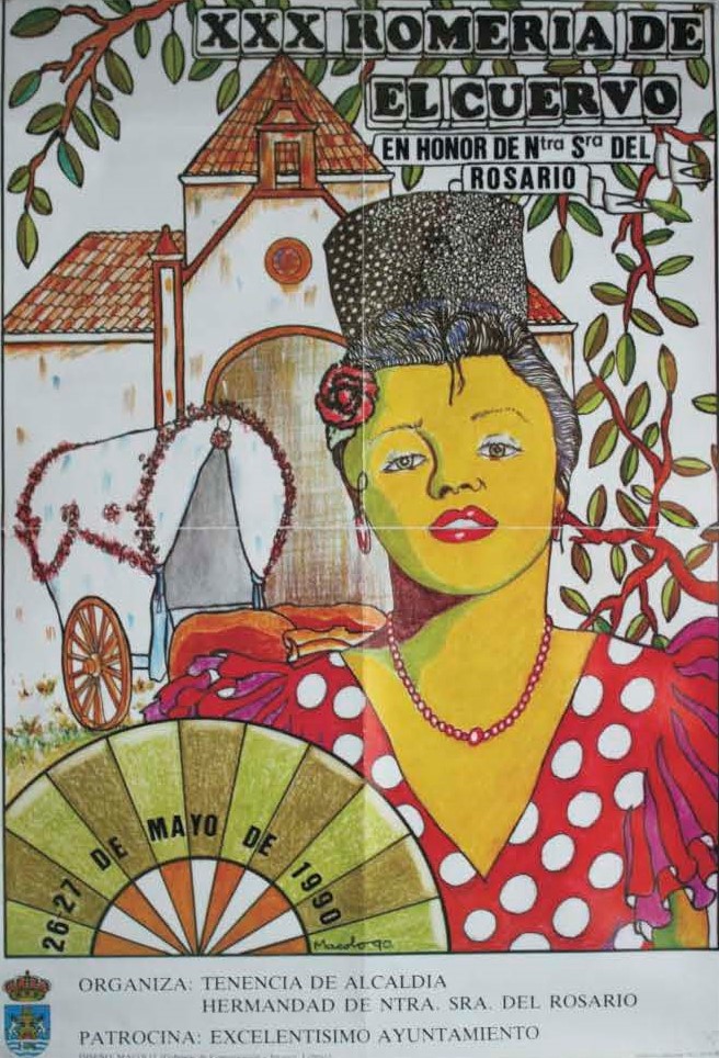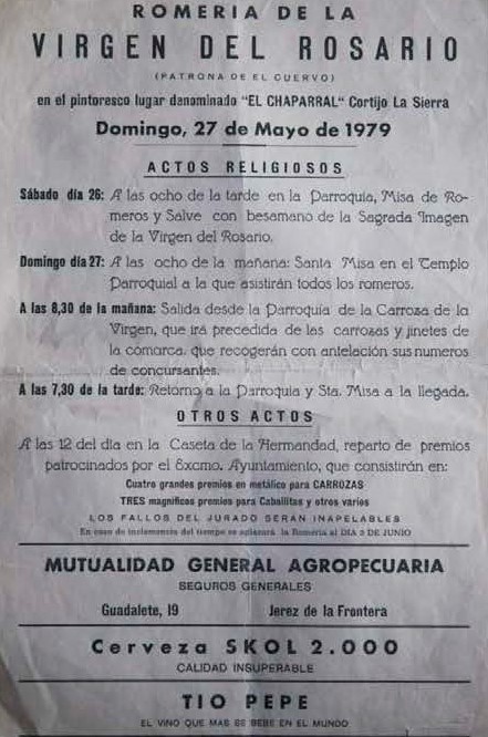 Haciendo un repaso gráfico por la historia de la cartelería de la Romerí de El Cuervo, podemos observar que los primeros carteles se hacían en folios y con pocos dibujos, a lo más uno representando la parte folclórica de la fiesta, originales los premios para carrozas y caballistas.